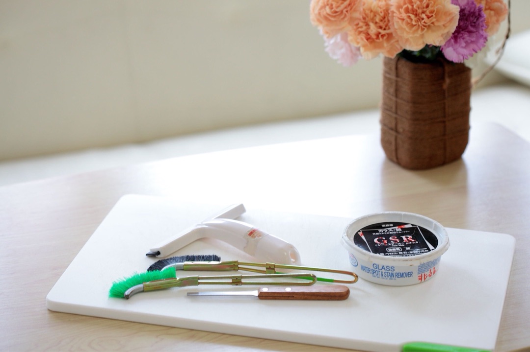 水切りワイパー、チャンネルブラシ、ケレン(隅っこ掃除に最適)GSR(研磨剤が入ってない洗剤)